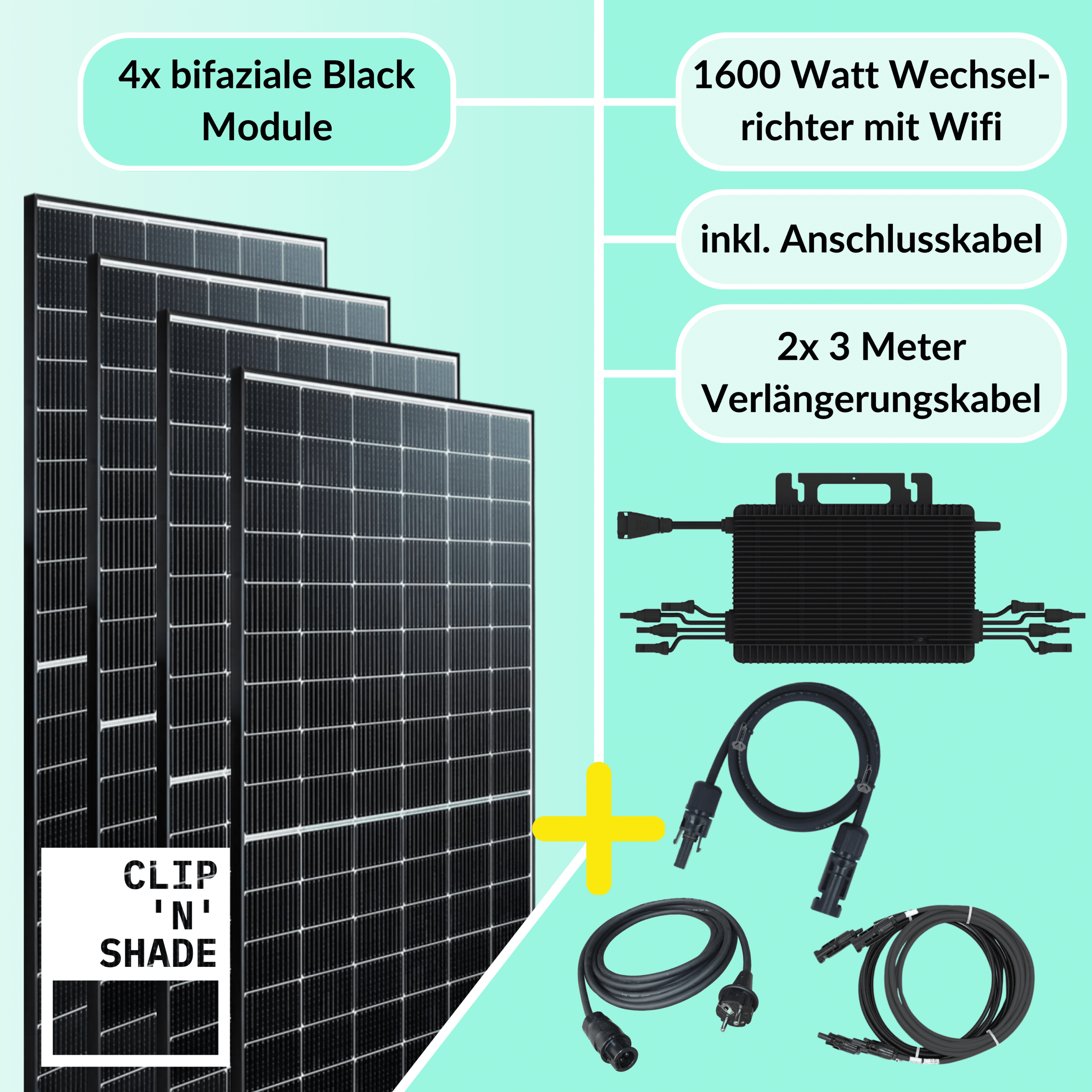 Composto da 4 moduli 430Wp Black e dall'inverter Hoymiles HMS-1600-4T + cavo di collegamento e di estensione.