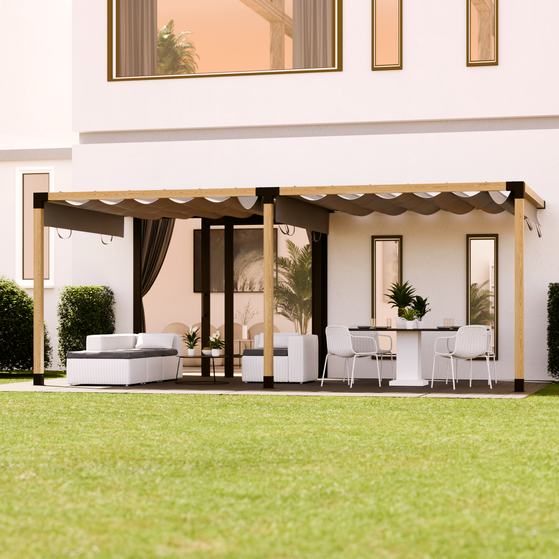 Trasformate il vostro patio in un rifugio elegante - con il nostro kit completo di pergola in legno con collegamento a parete su un lato. Che si tratti di copertura per patio, pergola o tettoia, questo set costituisce la base perfetta per il vostro progetto di costruzione personalizzato accanto alla casa.