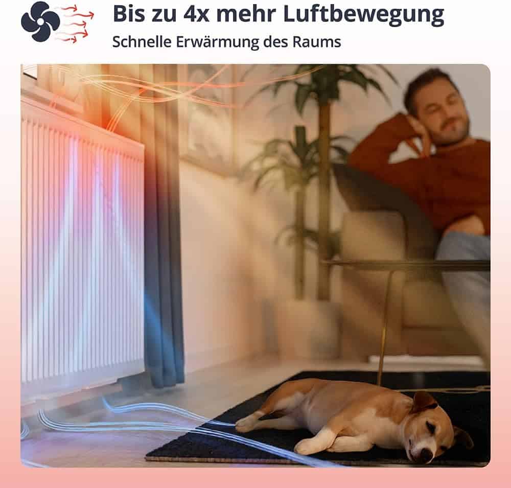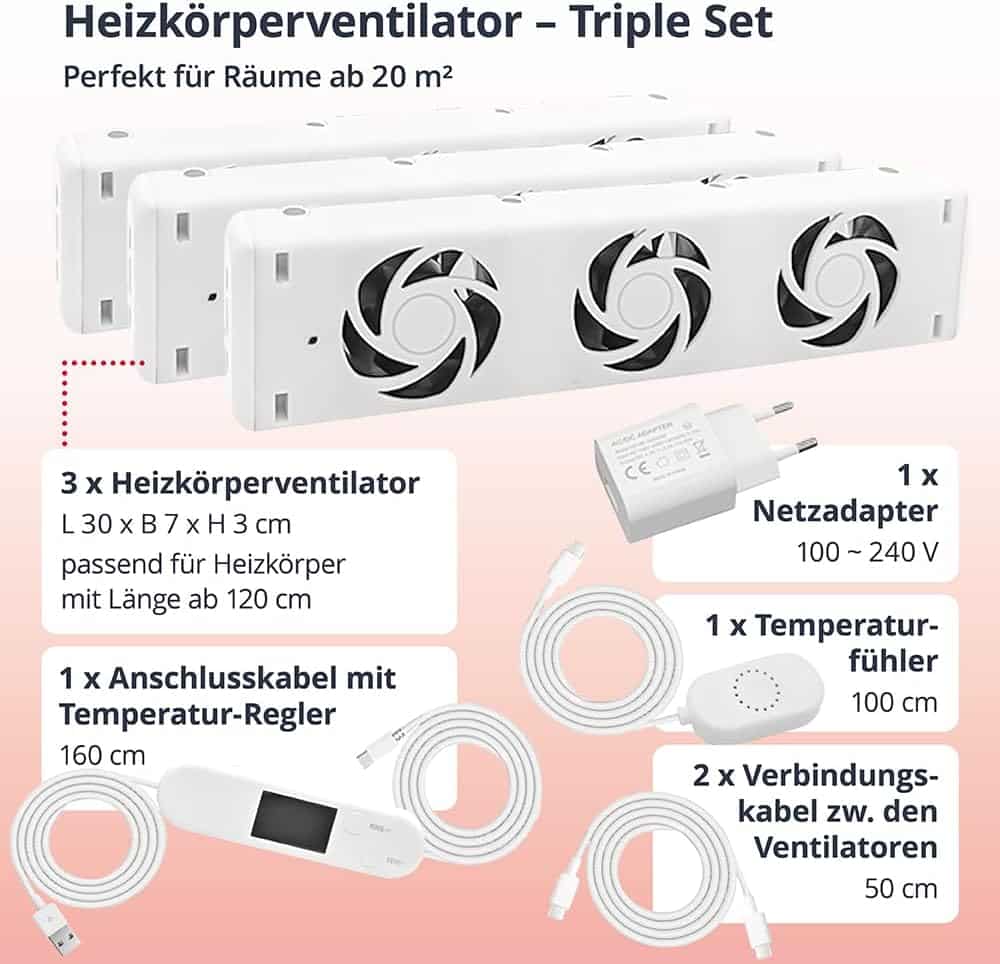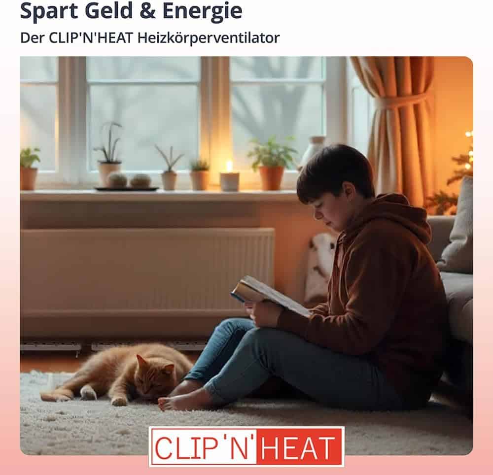 Il CLIP'N'HEAT Double Set accelera il riscaldamento delle stanze, consente di abbassare il termostato di 1-2 °C e fa risparmiare fino a 22 % sui costi di riscaldamento. La semplicità di installazione e il funzionamento silenzioso ne fanno la soluzione ideale per un riscaldamento efficiente e un maggiore comfort in casa. Con due ventilatori per radiatori in un set, è possibile massimizzare l'efficienza del riscaldamento e godere di una temperatura ambiente piacevole, grazie al set doppio di ventilatori per radiatori CLIP'N'HEAT.